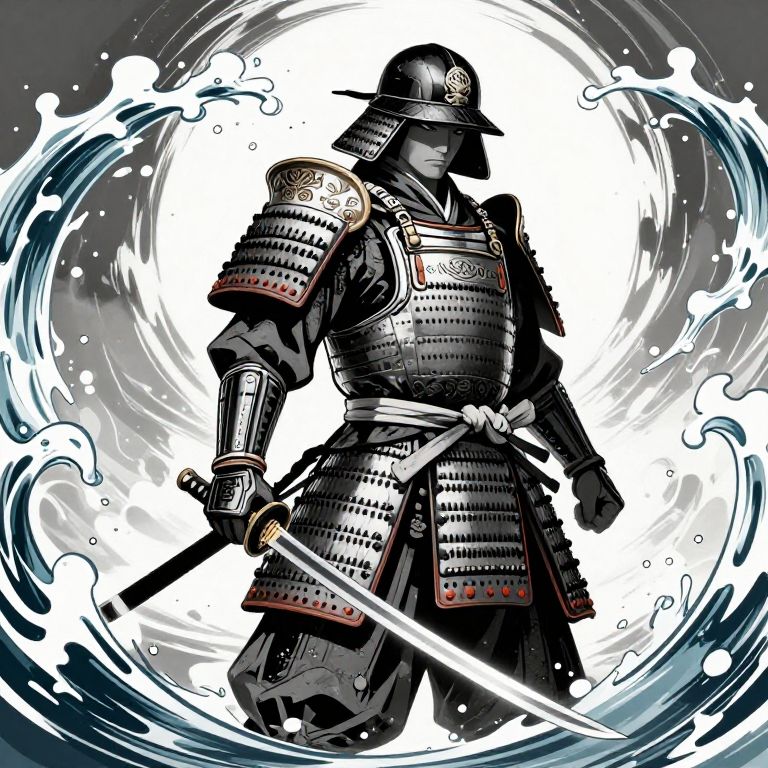 A striking illustration of a warrior in intricately designed armor, standing confidently with a katana. The image features dynamic swirling water elements, enhancing the sense of movement and intensity, showcasing a blend of traditional and modern artistry.