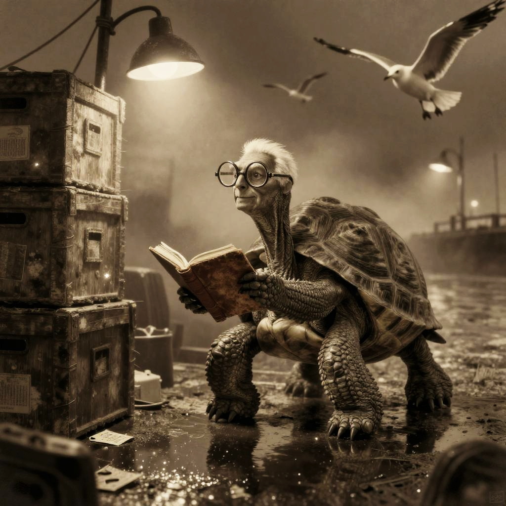Noir Tortoise Sleuth at Misty Docks