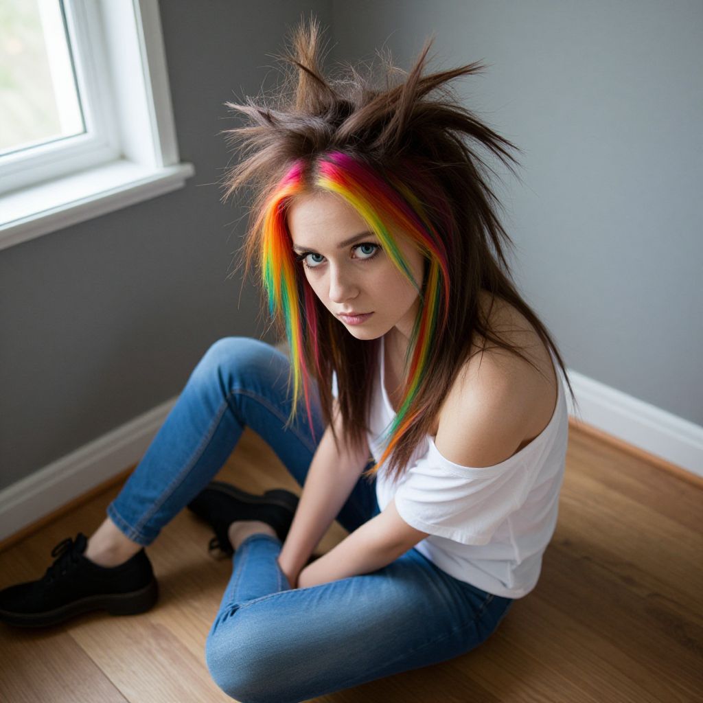 Photograph of a young woman with a wild, colorful hairstyle featuring bright rainbow streaks and large, spiky brown hair. She's sitting on a wooden floor in a room with gray walls and a window on the left. She's wearing blue jeans, a white off-shoulder top, and black shoes. Her intense blue eyes gaze directly at the camera, giving a striking, edgy vibe.