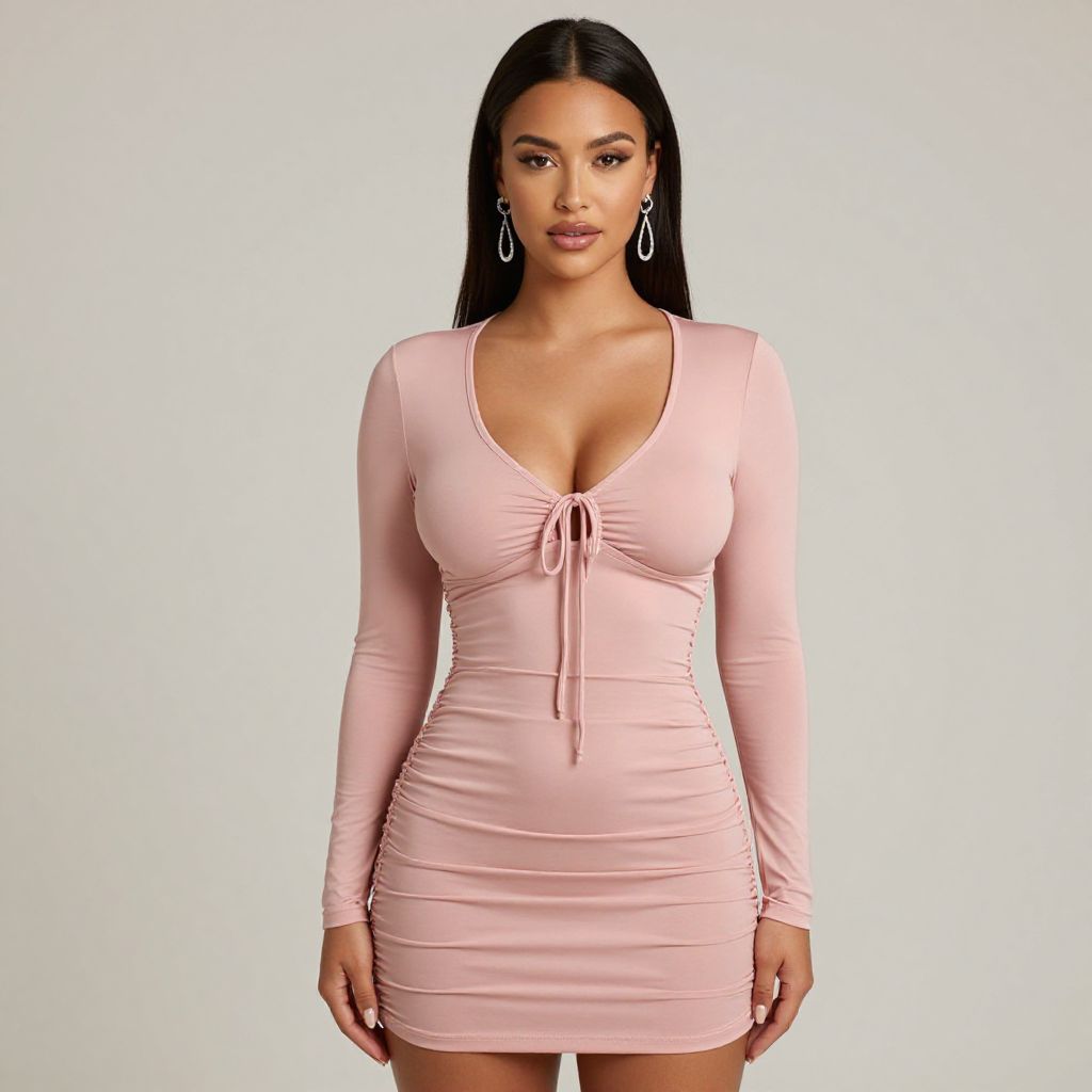 "Woman, bodycon style, ruched mini dress in blush pink, V-neckline, long sleeves, drawstring detail at the front creating a gathered effect, silver teardrop earrings, long dark hair styled straight, neutral makeup, plain light-colored background.. Sexy. Pretty face and beаutiful eyes. Big breasts."