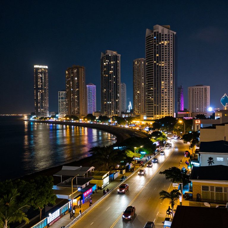 Photograph of a vibrant cityscape at night. Tall, illuminated skyscrapers with glowing windows line the dark, reflective waterfront, while a busy street below is lit by numerous streetlights and headlights. The street, adorned with parked cars and moving vehicles, features colorful neon signs from shops and businesses. Palm trees are visible along the street, and the sky is a deep blue. The water reflects the city lights, creating a shimmering effect. The scene is bustling and lively, with modern architecture and a mix of urban and coastal elements.