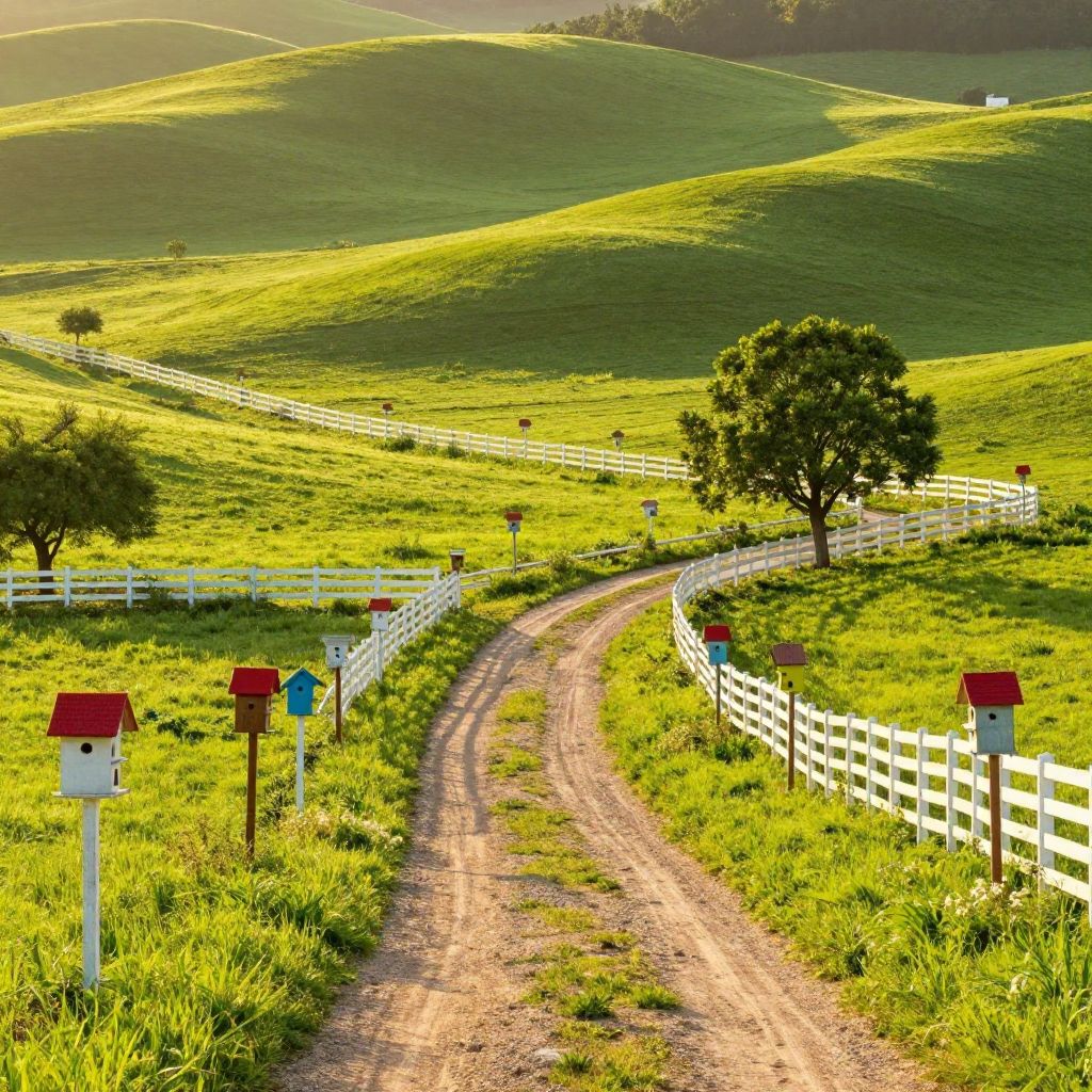 Bright sunrise illuminating a picturesque countryside landscape featuring lush green rolling hills, winding dirt path, white fences, scattered trees, and colorful birdhouses with red roofs. The scene captures a serene and vibrant rural setting with warm golden sunlight.