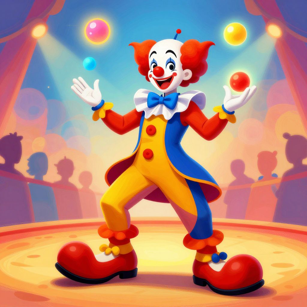 Colorful digital illustration of a joyful clown juggling three balls, wearing a blue and yellow outfit with red accents, under bright stage lights.
