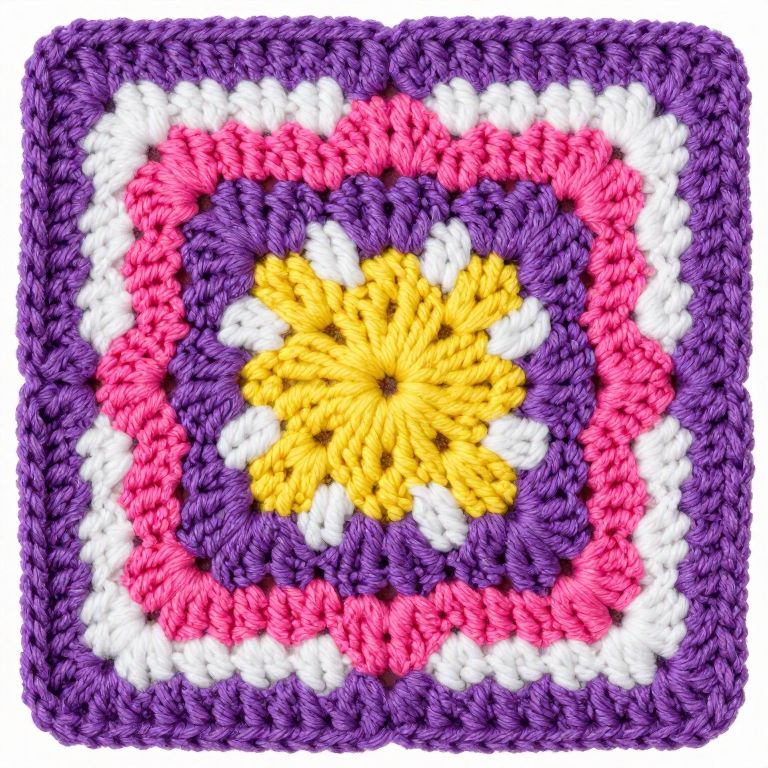 Vibrant crochet granny square featuring concentric layers of purple, pink, and white stitches surrounding a bright yellow center, showcasing intricate craftsmanship and symmetrical design.