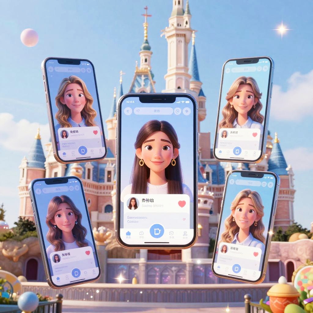 Fantasy scene showing a Disney filter app creating animated portraits on multiple screens floating in mid-air, dazzling light effects and playful cartoon animations, bright and colorful magic-themed user interface, highly imaginative digital rendering.