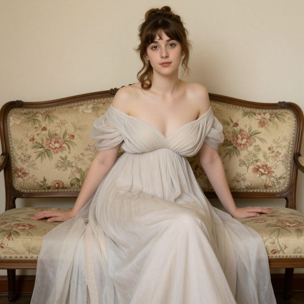 A digitally rendered portrait reminiscent of John William Waterhouse's style, featuring a woman in a flowing off-the-shoulder gown seated gracefully on a floral-patterned bench, bathed in soft, natural light that enhances the vintage aesthetic of the scene.