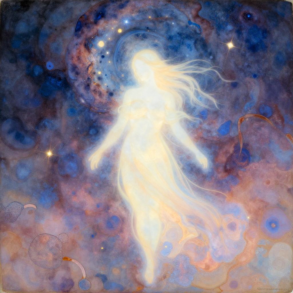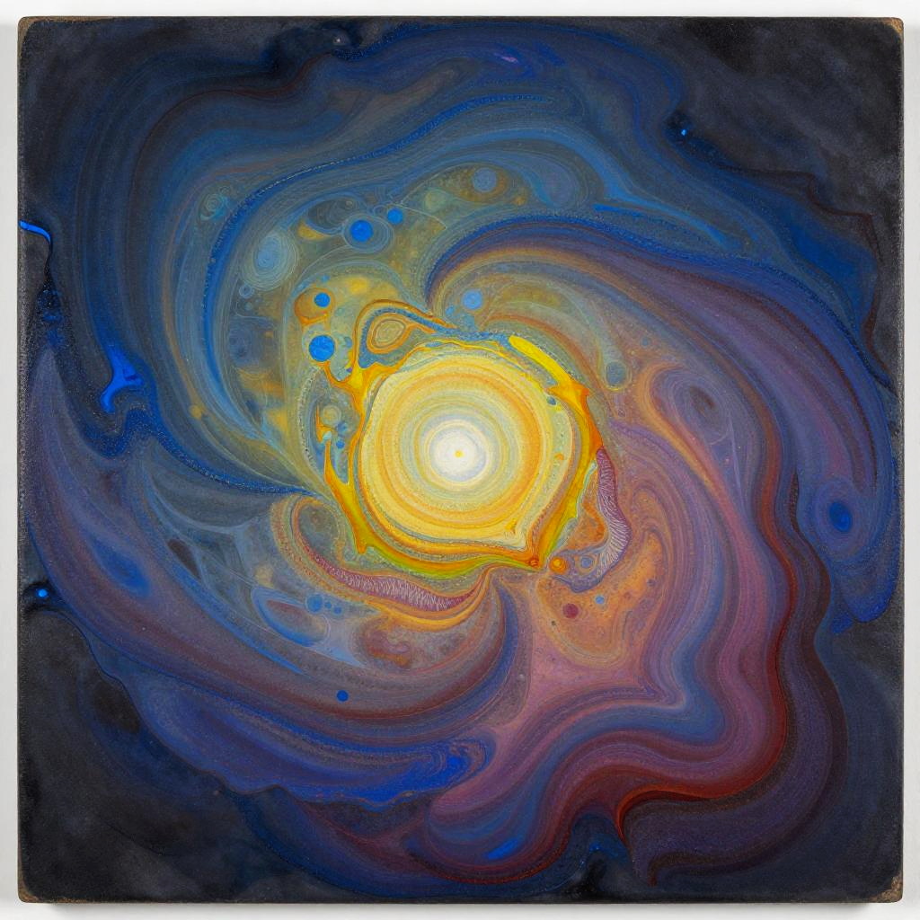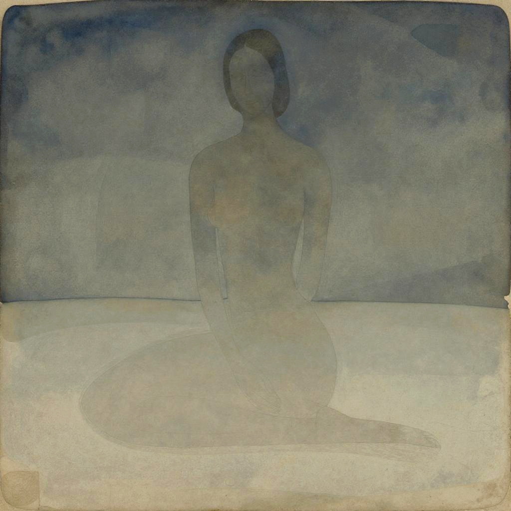 Abstract encaustic texture, gradient inking colors, Agnes Martin, a serene meditative figure, calm horizon, decoupage.