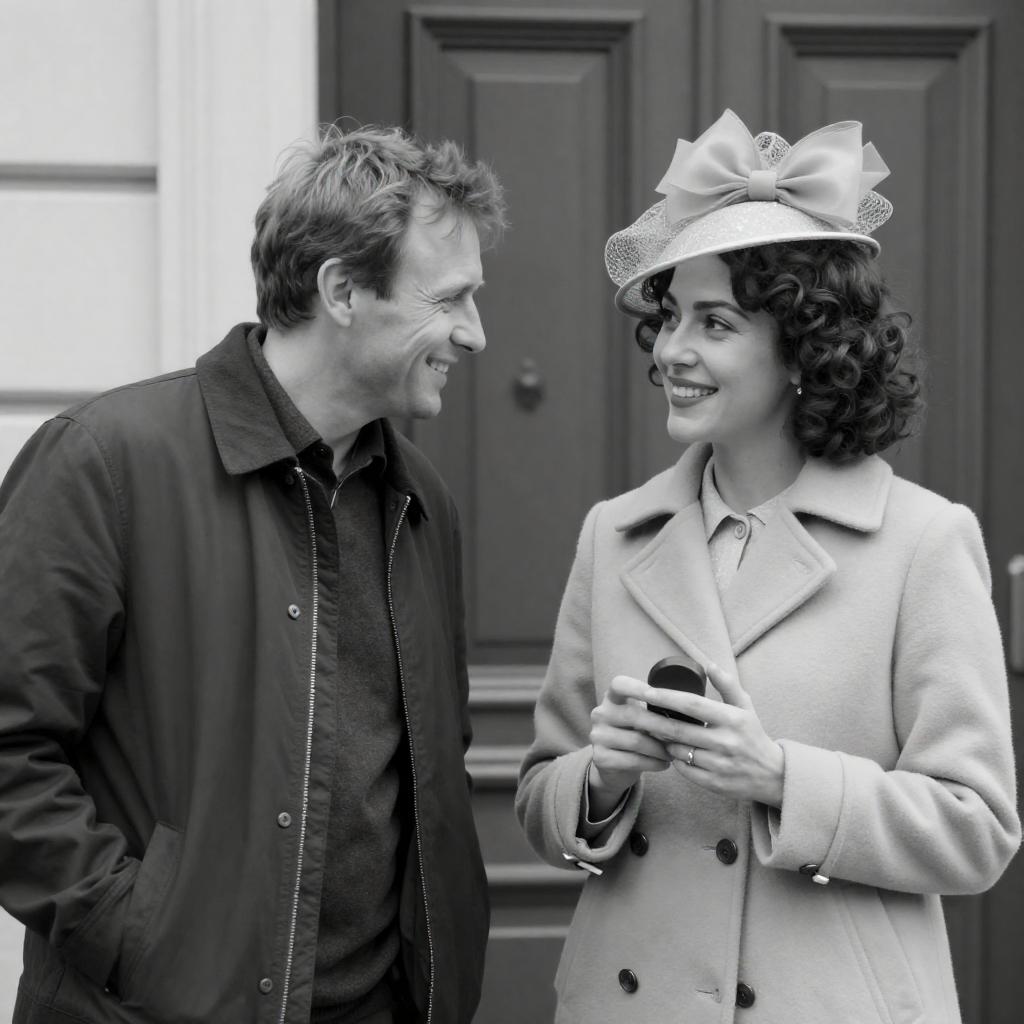 Black-and-white photograph of a man and woman sitting on a wooden porch swing. Man in pinstripe suit, polka dot tie, holding drink. Woman in lace dress, gloves, seated close, arm around his waist. Porch with columns, table with drinks. Man smiling, woman with calm expression. Man on left, woman on right.