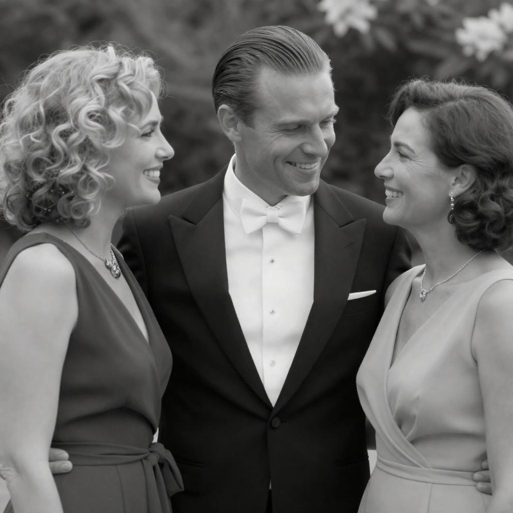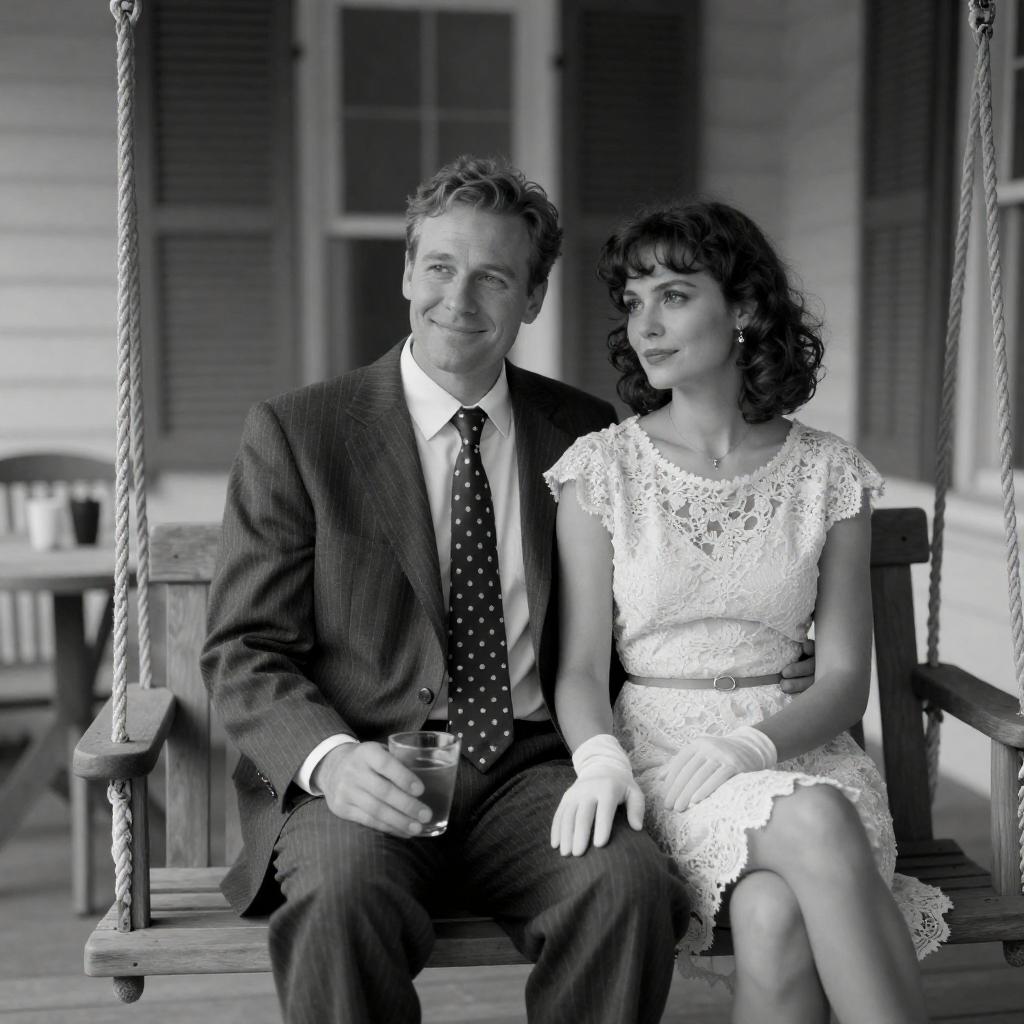 Black-and-white photograph of a man and woman sitting close together on a wooden porch swing. The man wears a pinstripe suit with a polka dot tie and holds a glass of drink. The woman wears a lace dress with gloves and has an arm around the man's waist. The porch features wooden columns and a table with drinks in the background. The scene conveys a vintage, classic atmosphere.