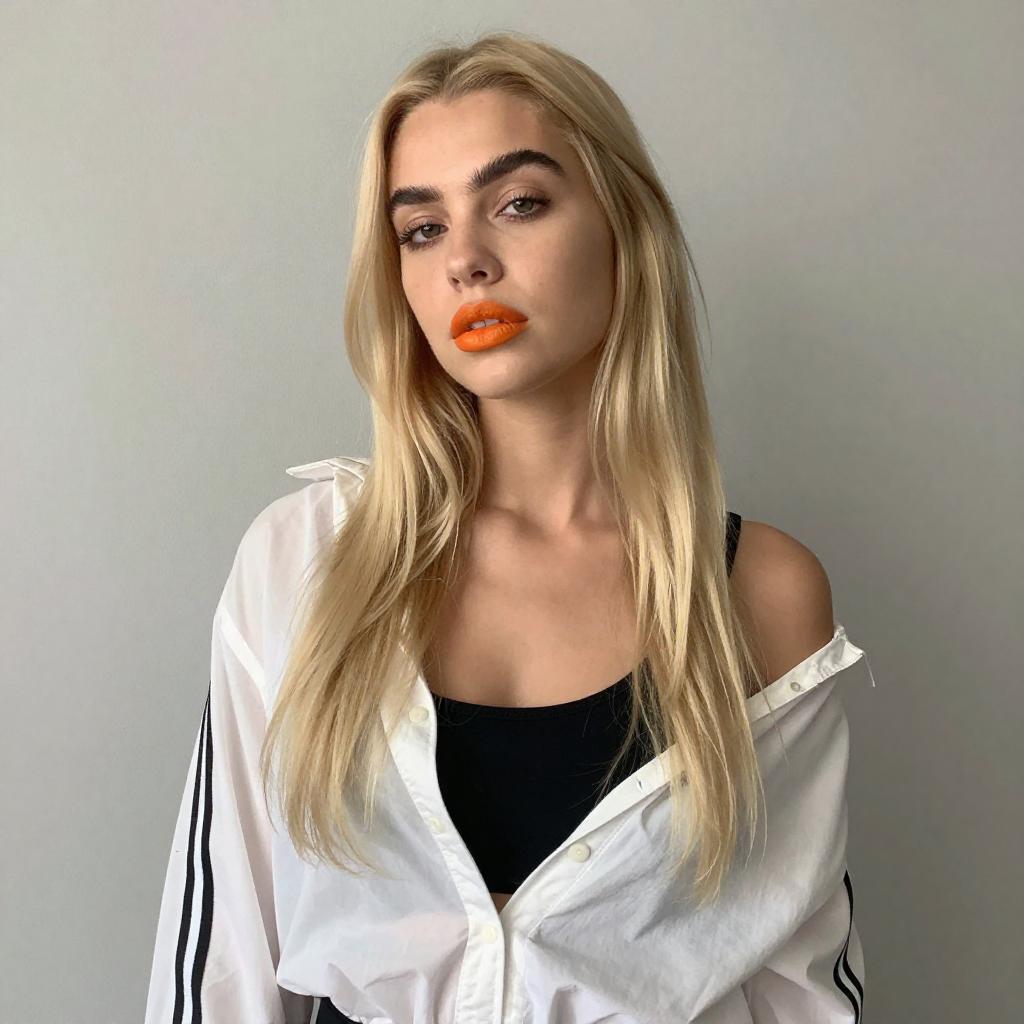 Photograph of a young woman with long, straight blonde hair, fair skin, and full eyebrows. She wears a white, off-the-shoulder jacket with black stripes, over a black top. Her lips are painted a bold orange. She stands against a ured, light gray wall, looking slightly to the side with a neutral expression.