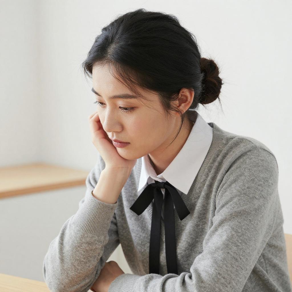 Photograph of an Asian woman with long black hair in a double bun, wearing a white shirt and gray sweater with a black bow. She leans forward, resting her chin on her hand, with a soft, melancholic expression. Bright white background and wooden surface behind her.