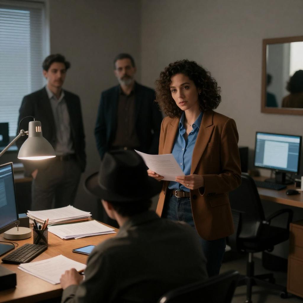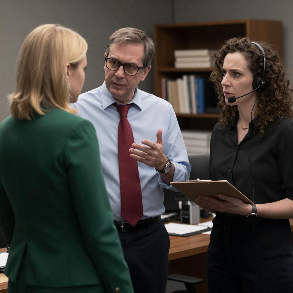 Photograph of two people in a dimly lit control room. Man with glasses and brown suit, intense focus, left. Woman with curly brown hair, white blouse, brown jacket, right. Both touch large control panel. Background: shelves with equipment, monitors.