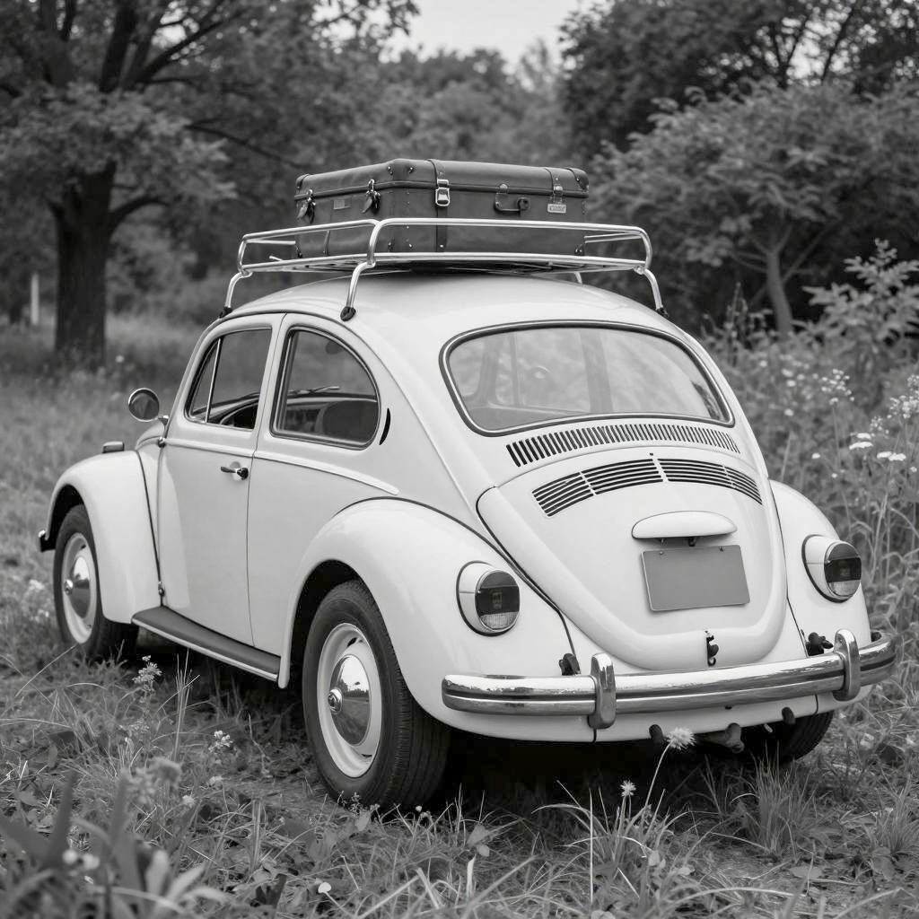Black and white photograph of a vintage Volkswagen Beetle with a roof rack and suitcase on top, parked in a grassy field. Trees in the background. Car facing away, license plate visible. Overgrown grass in foreground.