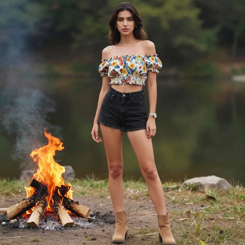 A lean woman in a casual summer outfit featuring a floral off-the-shoulder crop top and high-waisted black denim shorts, tan ankle boots, and a simple wristwatch, stands by a lake with a bonfire, captured in a vibrant production IG style. Sexy. Pretty face and beutiful eyes