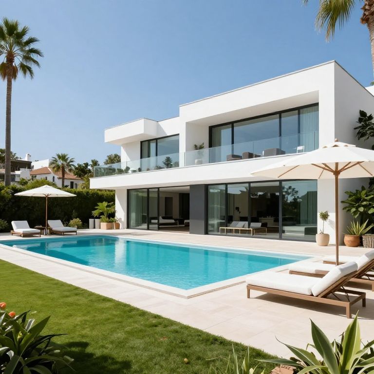 Modern luxury villa showcasing sleek white architecture with expansive glass walls, featuring a pristine rectangular pool surrounded by plush lounge chairs and a large patio umbrella, set against lush greenery and palm trees along the New Golden Mile between Marbella and Estepona.
