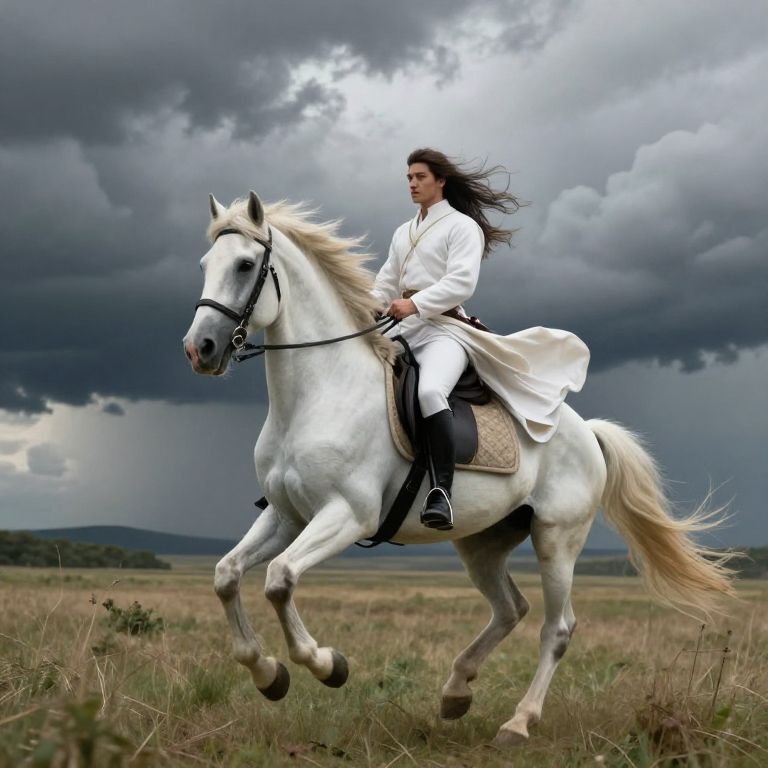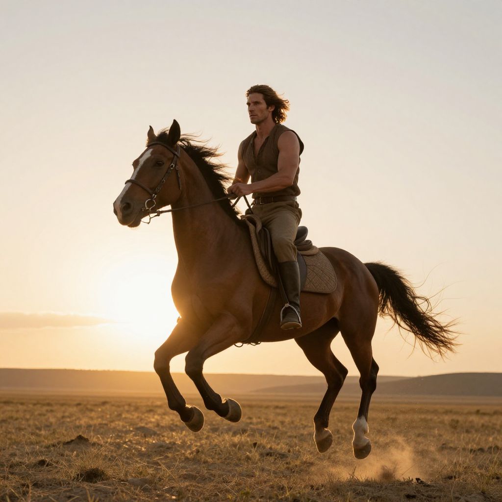 A majestic man on horseback, soaring across vast open terrain, sun setting behind him, golden hues illuminating his rugged features, strong arms grasping reins, flowing mane and tail streaming in the wind, vast landscape unfolding before them, serenity and freedom captured in this breathtaking moment. Man has masculine face and piercing eyes