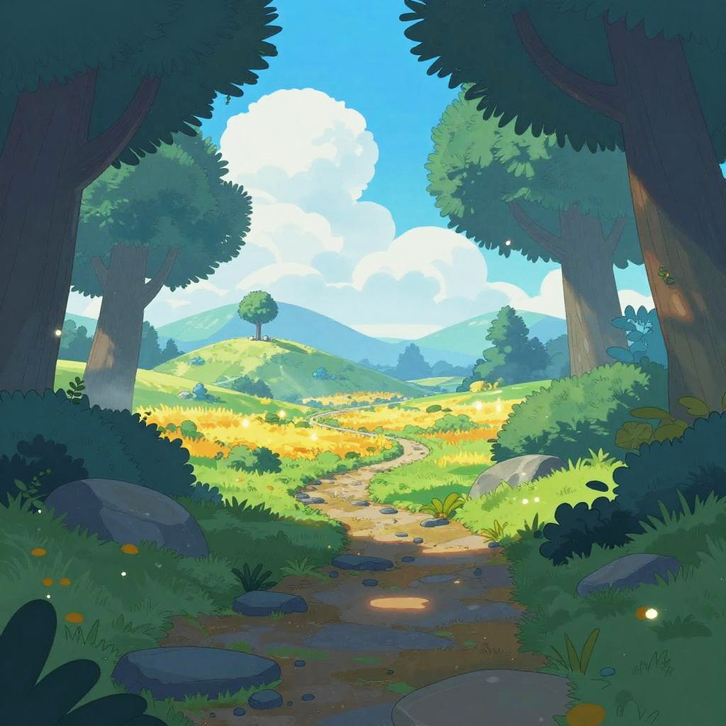 Cel-shaded animation landscape set in enchanted forest in early autumn, bright blue sky with fluffy clouds. Oversized blue-tinted shapes frame a rocky path winding into a glowing golden field; a small landmark rests on a distant hill amid lush greenery. Saturated palette, crisp outlines, dithered textures, soft bloom, subtle fog, playful particles, storybook charm, magical and serene.