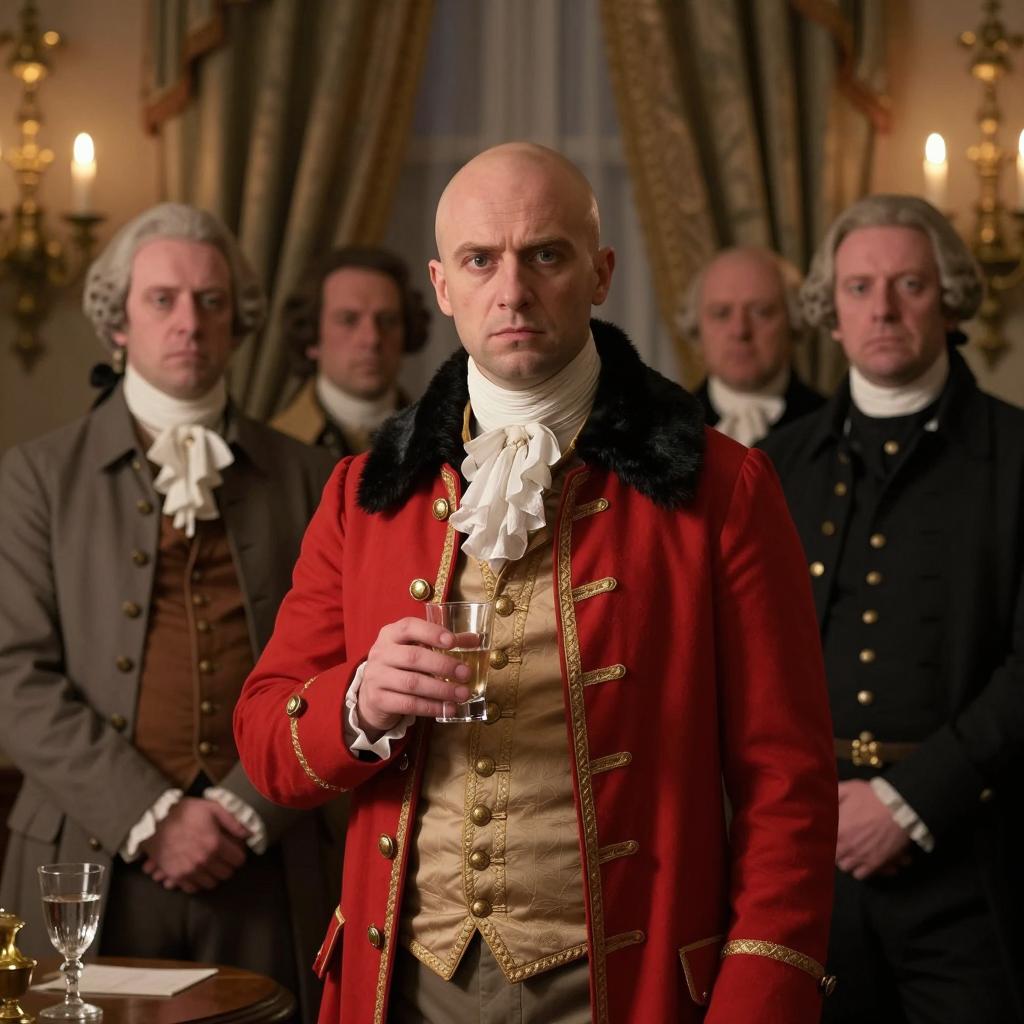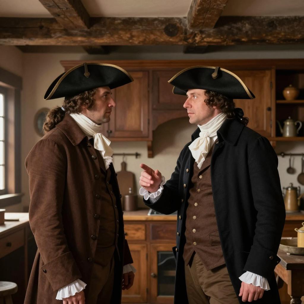 Two men in 18th-century clothing stand in a wooden kitchen. Both wear black tricorne hats and brown coats. The man on the right has a white necktie and black coat with gold buttons. They face each other, with the right man slightly leaning forward. Wooden beams and cabinets fill the background. The right man's hand is raised, as if gesturing.
