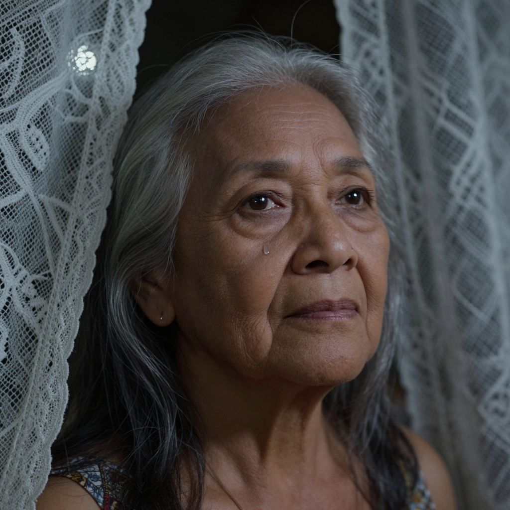 Photograph of an elderly woman with long, gray hair, and deep wrinkles. She has dark brown eyes and a small tear on her right cheek. She wears a dark, patterned top and is partially obscured by white, lace curtains with intricate floral designs, which are slightly illuminated from the left. Her expression is somber and reflective, with a slightly downturned mouth. The background is dark, emphasizing her face and the lace curtains, creating a poignant, intimate atmosphere. The lighting is soft, highlighting her facial features and the texture of her skin.