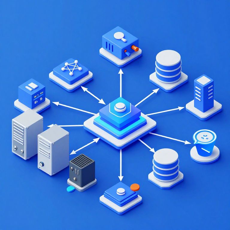 CGI illustration of interconnected blue and white electronic devices with arrows, set against a vibrant blue background, showcasing a network system.