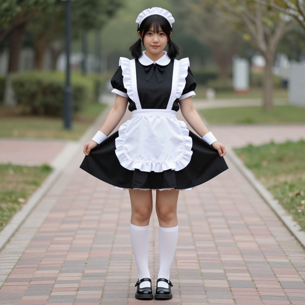 Photograph of an Asian woman in a black and white French maid outfit, standing on a brick path in a park.