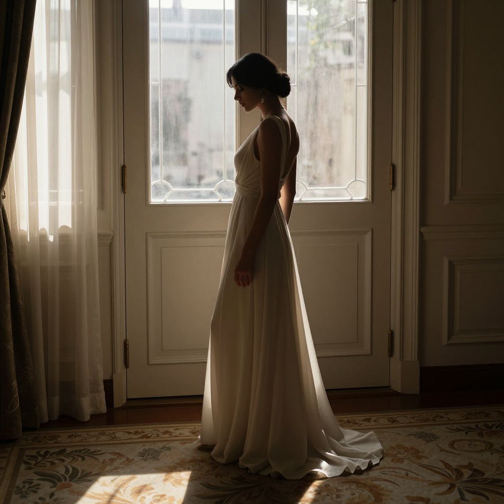 Elegant silhouette of a woman in a flowing cream gown stands by a pair of ornate double doors, her gaze directed downward as soft sunlight filters through sheer curtains, casting gentle shadows on the floral-patterned carpet beneath.