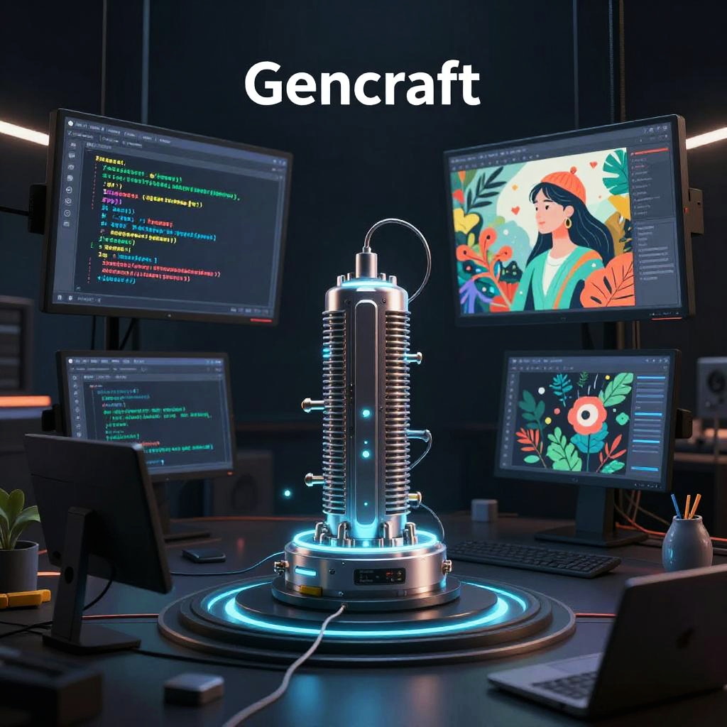 Gencraft AI review illustration portraying a futuristic AI engine generating visual art on multiple screens, surrounded by code streams and creative tools, dark mode interface, immersive digital art studio setting, glowing interface elements, high detail.