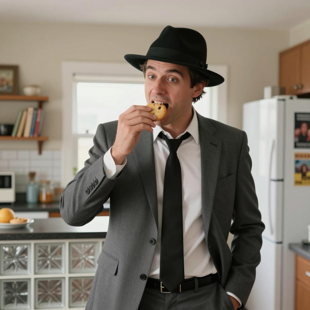 A man in a gray suit, white shirt, black tie, and black fedora eats a cookie with his mouth open. He has light skin and short dark hair. His right hand holds the cookie, while his left hand is behind his back. He stands in a kitchen with beige walls, a fridge on the right, shelves with books on the left, and a window in the background. The fridge has posters on it, and the kitchen counter has a glass block wall. The man's expression is focused on the cookie.