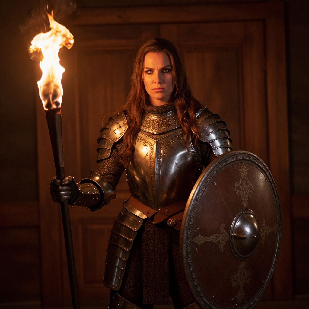 Photograph of a fierce-looking woman with long brown hair standing in a dimly lit wooden room. She's wearing shiny, medieval-style steel armor with intricate patterns, holding a flaming torch in her left hand and a large round shield in her right. The warm light from the torch casts dramatic shadows, highlighting her determined expression and the texture of her armor.