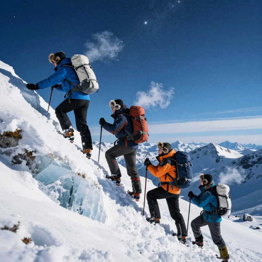Adventurers Scaling Icy Mountain Peaks