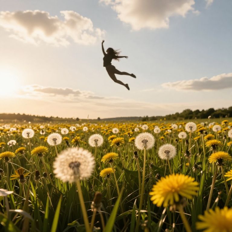 Golden dandelions sway gently in a sunlit meadow as a solitary figure glides gracefully above, silhouetted against a soft, cloud-dotted sky.