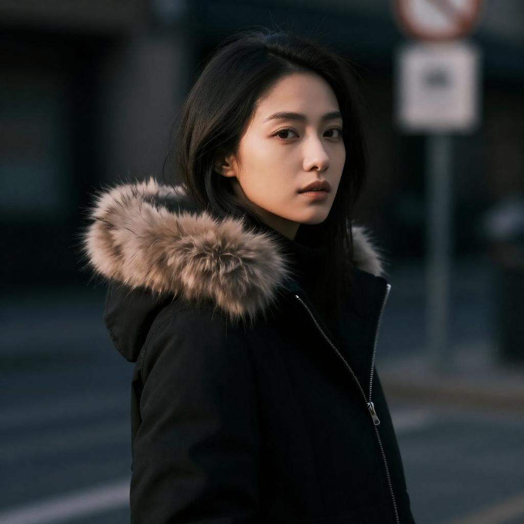 Edgy fashion portrait of a woman in a black leather jacket, braless, covered breasts, fitted moto jacket with quilted shoulders and silver zippers, Asian woman with straight jet-black hair and porcelain skin, soft nude lips, hands in pockets of high-rise dark blue jeans with raw edge cuffs, standing in city alley at dusk with bokeh streetlights, confident expression, cinematic lighting, high resolution, ultra-detailed