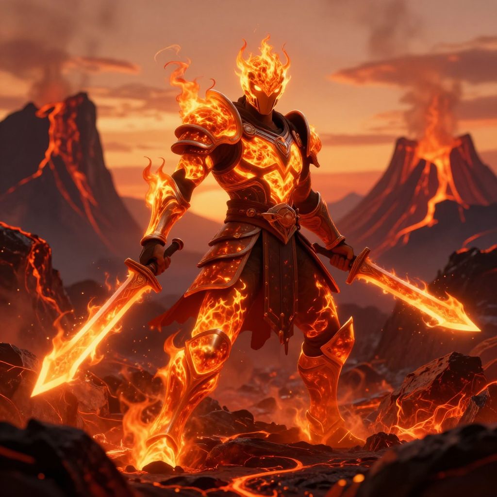 Digital artwork depicting a fiery, armored warrior with glowing orange and red flames enveloping their body. They stand in a rocky, volcanic landscape with jagged mountains in the background, lit by a fiery sunset. The warrior wields two large, flaming swords, one in each hand. The armor is detailed with intricate, metallic designs, and the overall scene exudes a sense of intense heat and power. The sky is painted in warm hues of orange and red, enhancing the fiery theme. The image has a dramatic, high-fantasy style.
