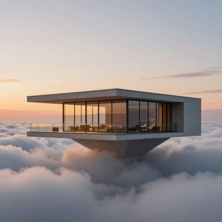 Modern floating house with glass facade, elevated above a sea of clouds at sunset. Sleek, minimalist architecture against a pastel sky. Photorealistic