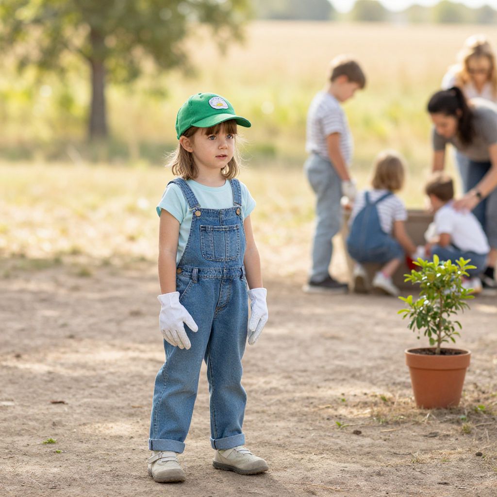 A young girl with brown hair, wearing a green cap and blue overalls, stands on a soft dirt ground. She has white gloves on her hands, giving off a playful and curious expression. In the background, there are other children and adults engaged in a quiet outdoor activity, with a small potted plant gently placed near the edge of the scene. The setting is a sunny countryside field, with soft sunlight filtering through the trees, adding warmth and depth to the image.