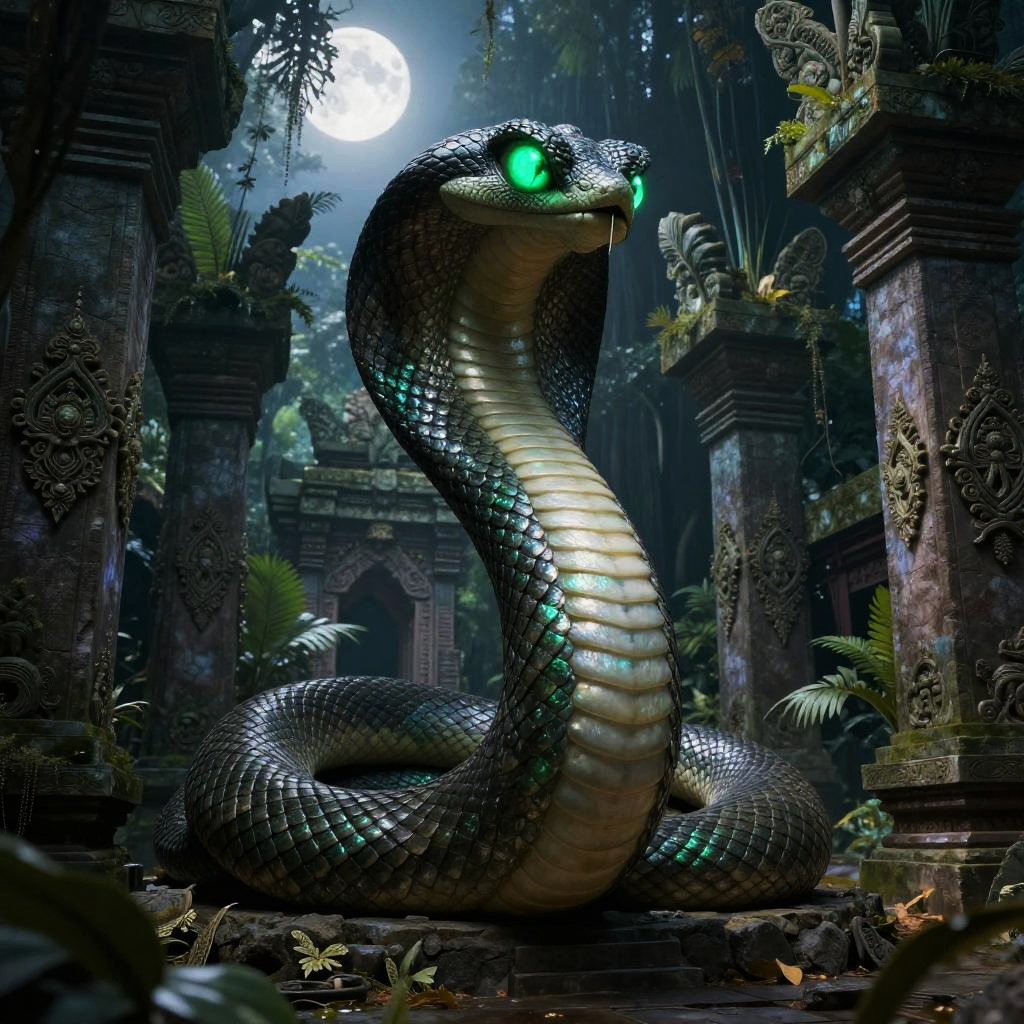 Serpent deity rising from a misty river, golden scales reflecting dawn light, adorned with tribal jewelry and ancient runes, surrounded by lush tropical foliage, mythological atmosphere