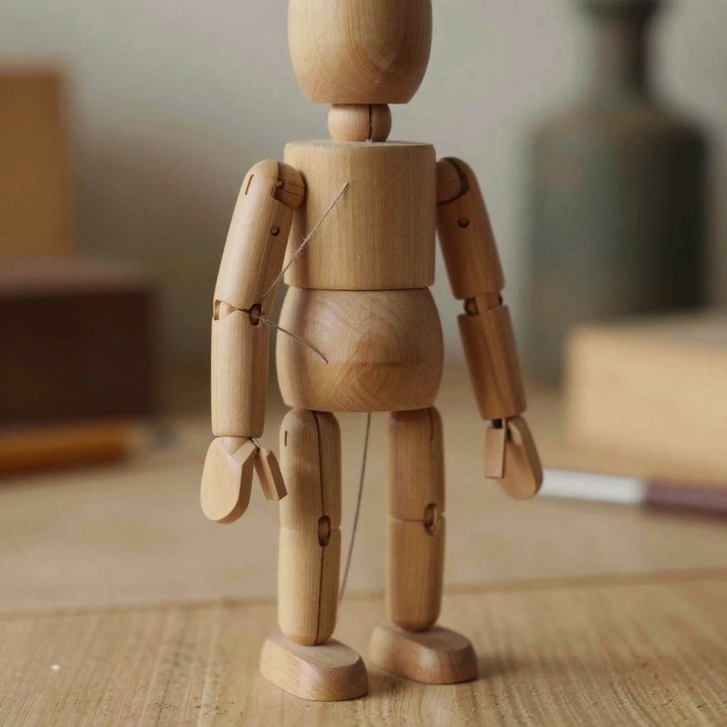 Close-up of a jointed wooden puppet with intricate, visible hinges and strings, set against a soft vintage workshop background, warm natural lighting highlighting the craftsmanship and delicate shadows, evoking a nostalgic and artistic atmosphere.
