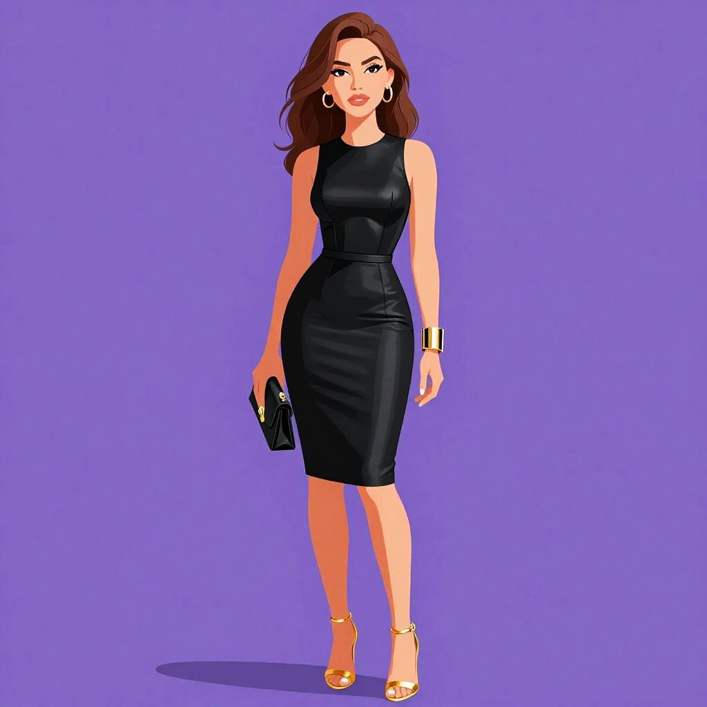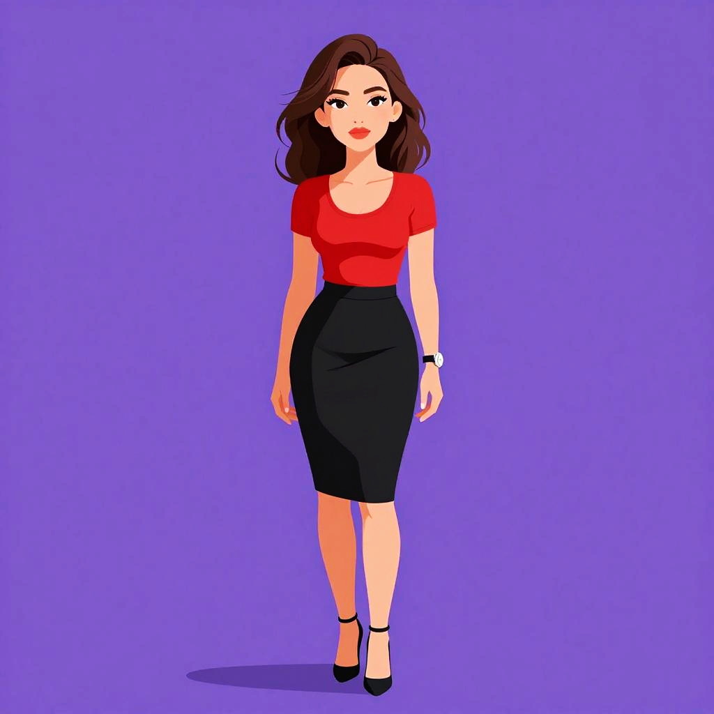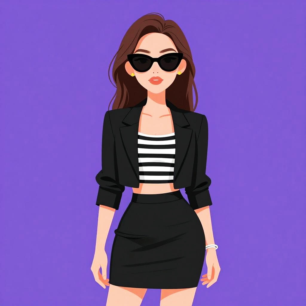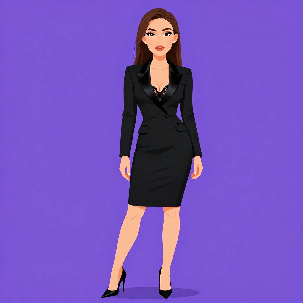 Illustration of a confident woman with medium skin tone and long brown hair, wearing a structured black blazer featuring a deep V-neckline with nude mesh paneling and a high-waisted bodycon black mini skirt. She is set against a solid purple background, embodying a stylish business casual look.