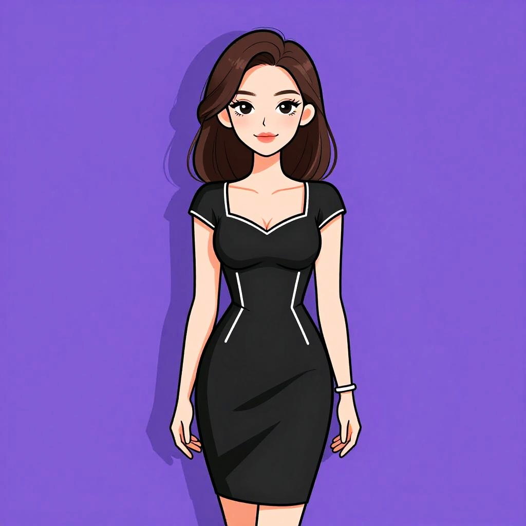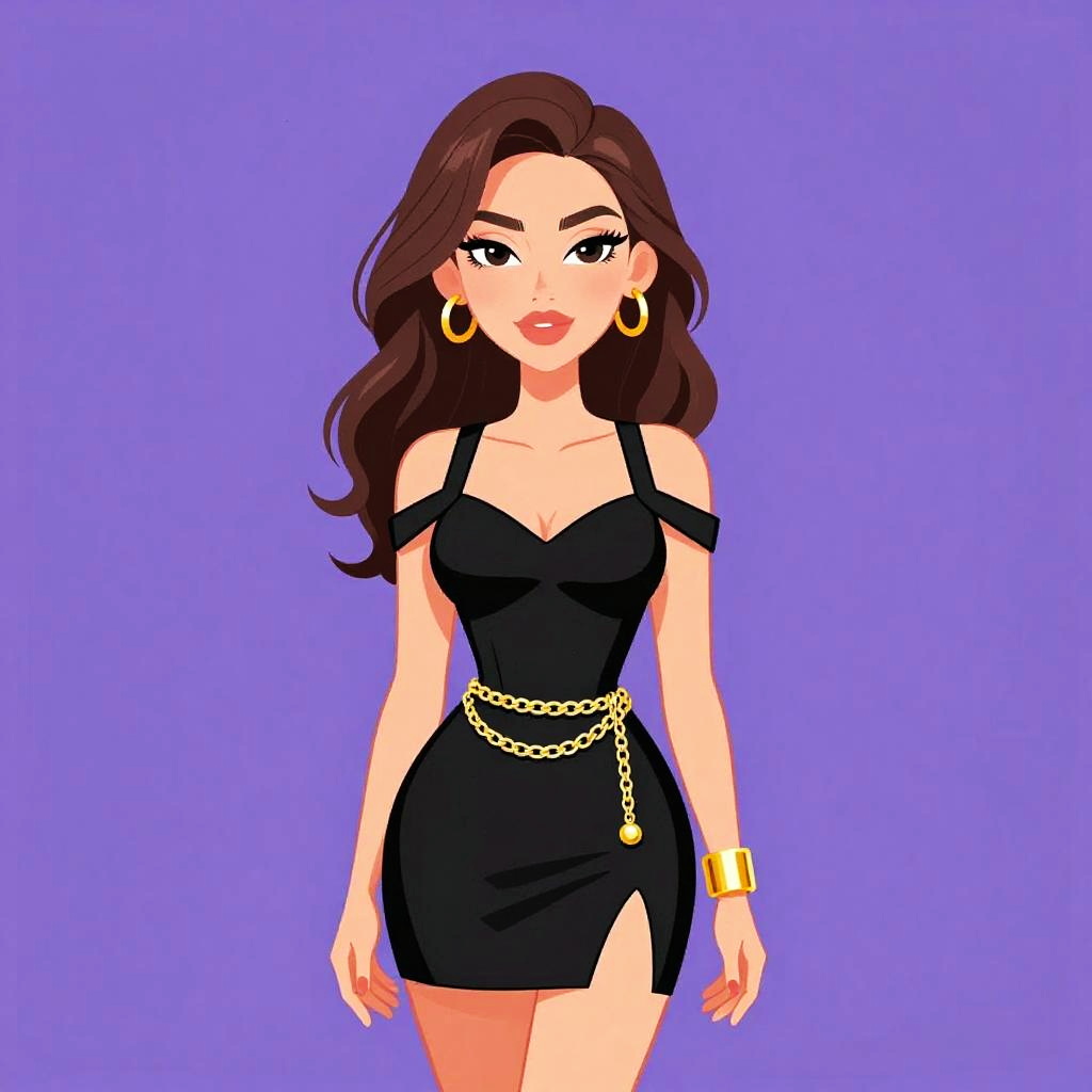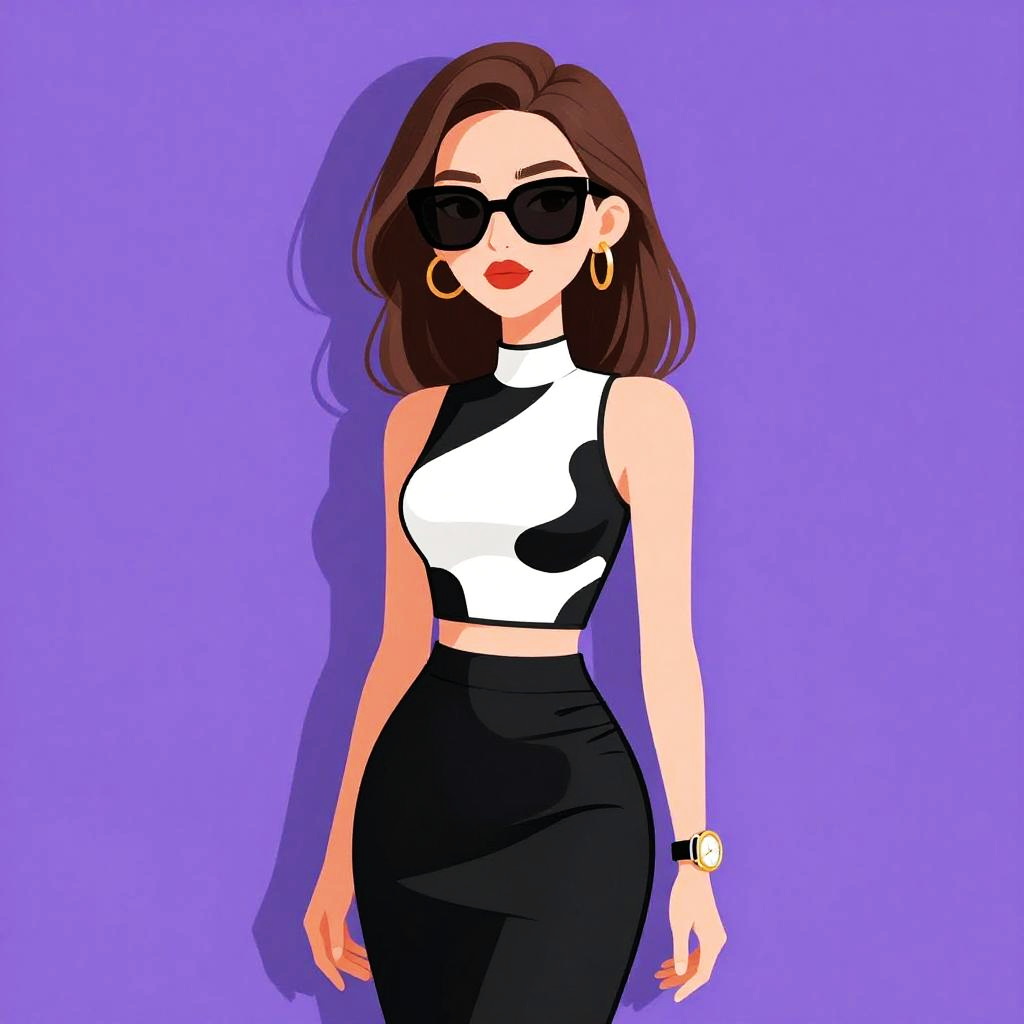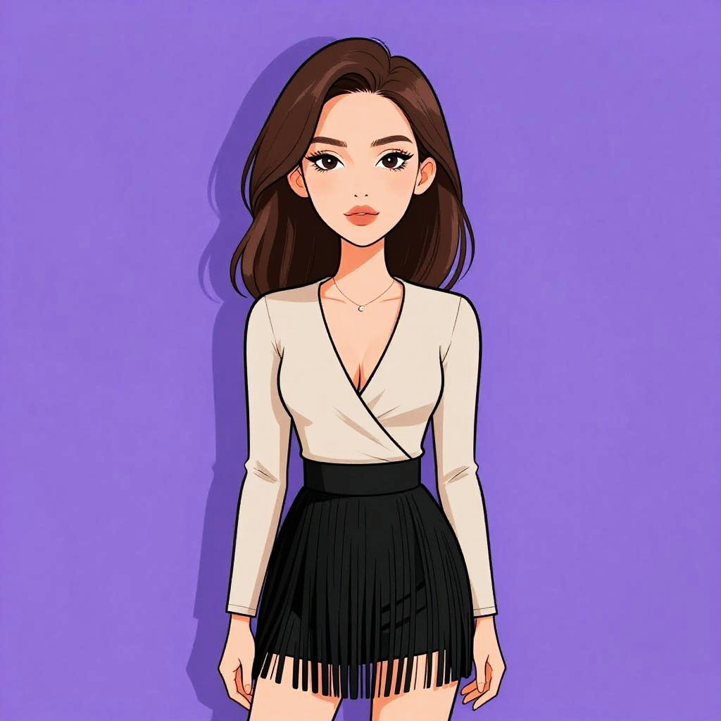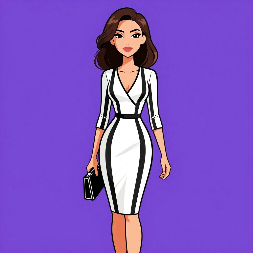 Illustration of a confident woman with medium skin tone and long brown hair, wearing a structured black blazer featuring a deep V-neckline with nude mesh paneling and a high-waisted bodycon black mini skirt. She is set against a solid purple background, embodying a stylish business casual look.
