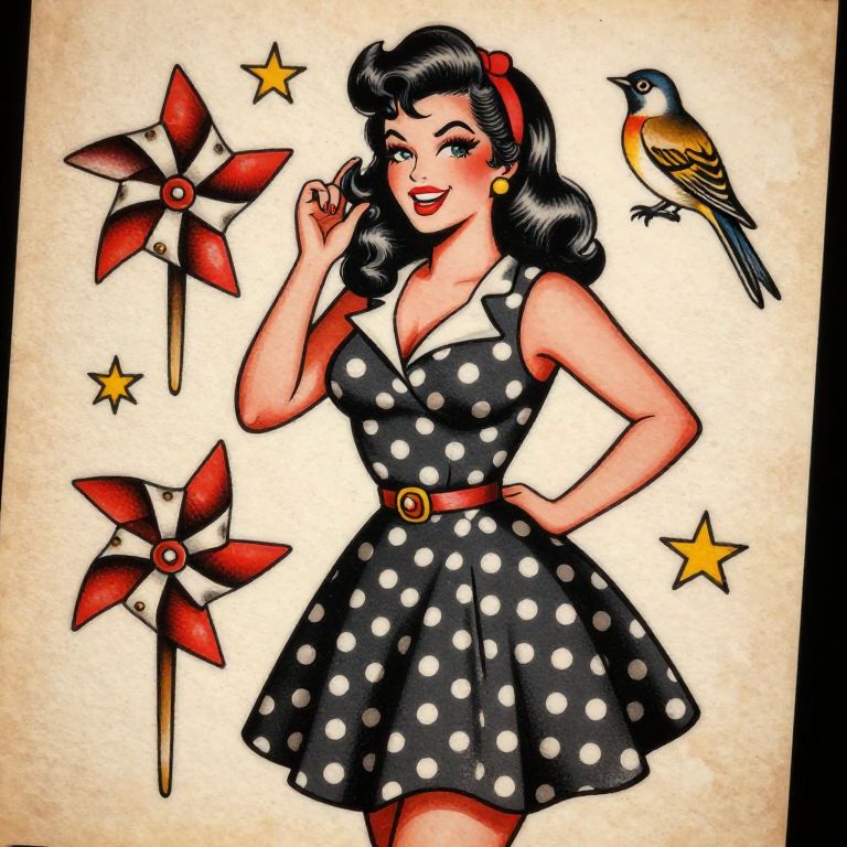 Classic American pin up tattoo scene featuring a nostalgic pin up girl in a polka dot dress with a playful smile, accompanied by traditional Americana tattoo elements like pinwheels, stars, and sparrows, rich colors and stylized shading detail, vintage flair.