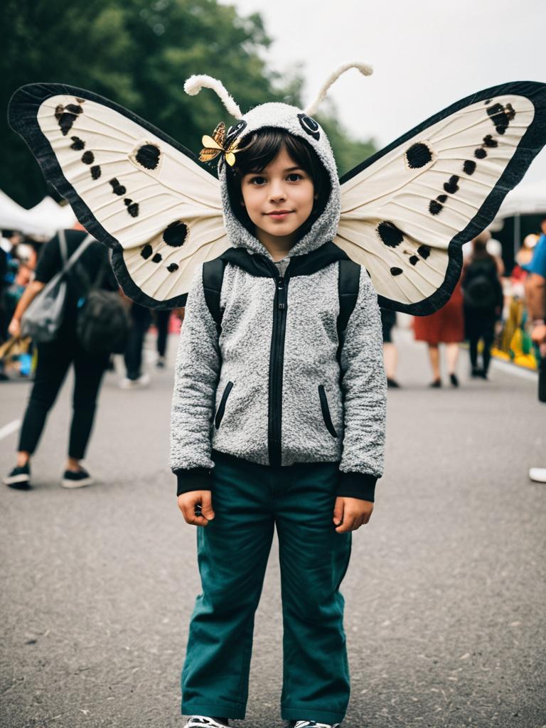 Boy in Moth Costume, whimsical cosplay festival photo, photorealistic realism