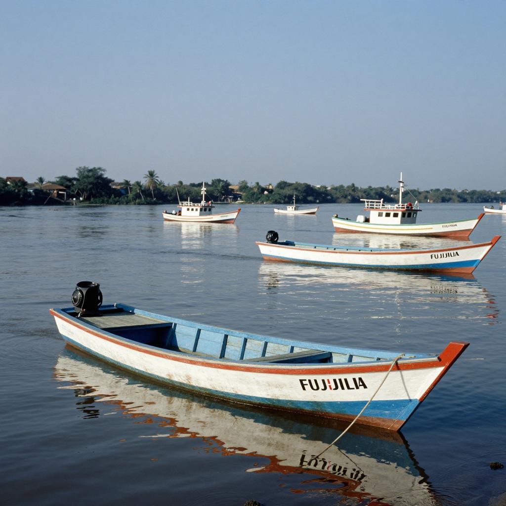 A traditional long boat with star patterns on its side, floating in calm water. A person with long hair in the foreground, partially visible on the left. Boat filled with rocks. Horizon in the background.