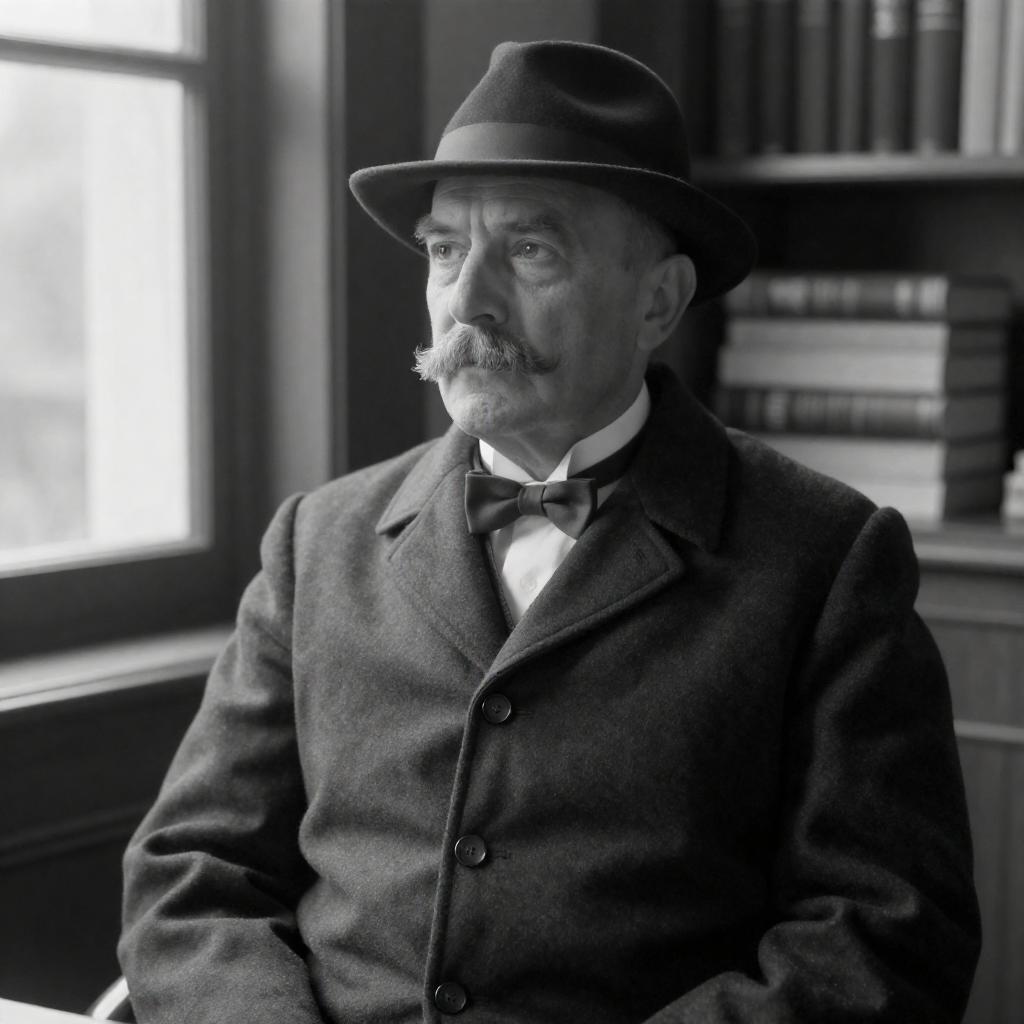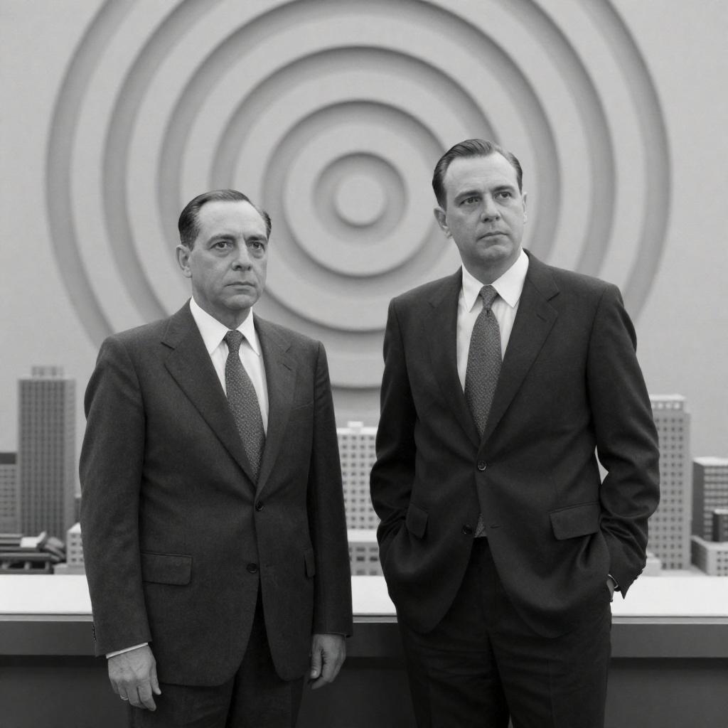 Sepia-toned photograph of two men in dark suits with bow ties, standing side by side. Both have serious expressions. Left man has a mustache, right man has slicked-back hair. Table with glasses, bottles, and candelabra in front. Background is dark. Two men, formal attire, serious expressions, table with objects.