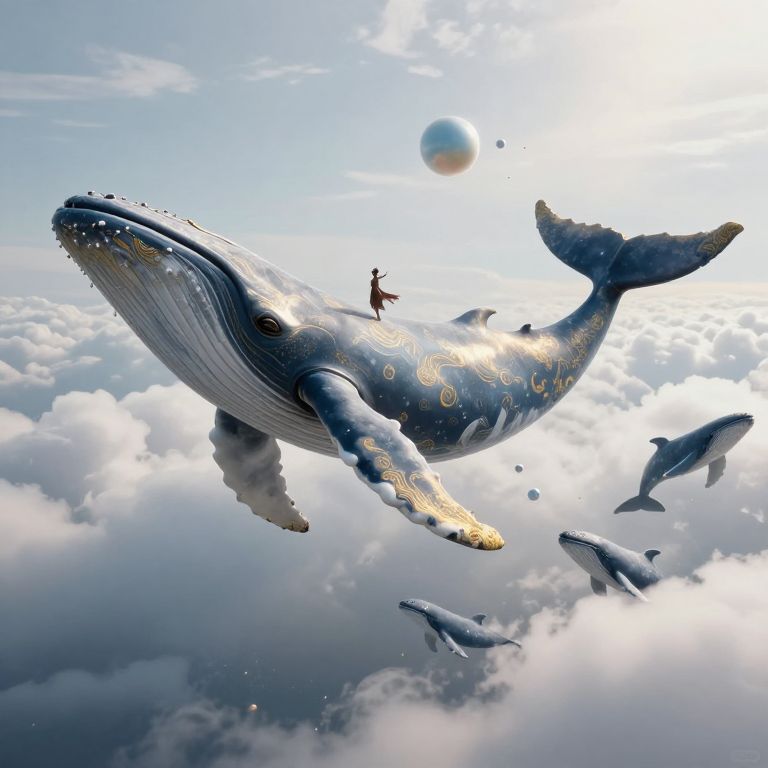 A colossal whale adorned with intricate golden patterns glides serenely through a cloud-filled sky, bearing a lone figure upon its back as smaller whales and floating orbs accompany it in this ethereal, gravity-defying realm.