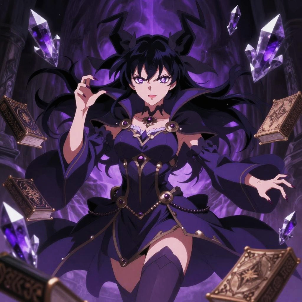 Powerful purple witch anime casting a dark spell, surrounded by floating purple crystals and enchanted books, dramatic lighting highlighting her intricate costume and intense expression.
