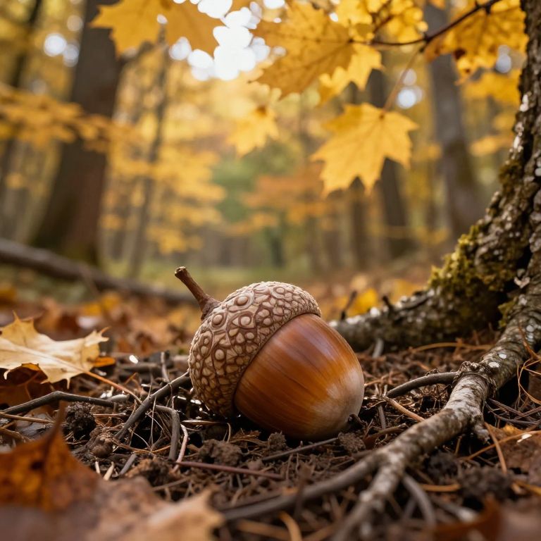 In the enchanting style of surrealism, depict a serene autumn forest scene from an acorn's perspective nestled in the rich, earthy soil. Sunlight filters through golden leaves overhead, casting a warm glow on the vibrant fall foliage that contrasts beautifully with the soft hues below. Delicate patterns on the acorn shell merge seamlessly with nearby tree roots, creating a thought-provoking visual that invites viewers to ponder interconnectedness and appreciate the beauty found in unexpected places.