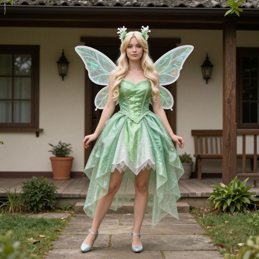Photograph of a young blonde woman standing in front of a quaint, rustic house with white walls and brown wooden trim. She wears a green, strapless, tiered fairy dress with sparkling fabric and translucent wings attached to her back. Her long, wavy hair is adorned with a white floral crown. She also wears silver high-heeled shoes. The background includes a wooden porch, potted plants, and a stone pathway. The setting is a serene, garden-like area with greenery visible on either side. The woman's expression is neutral, and she stands with her arms slightly apart.