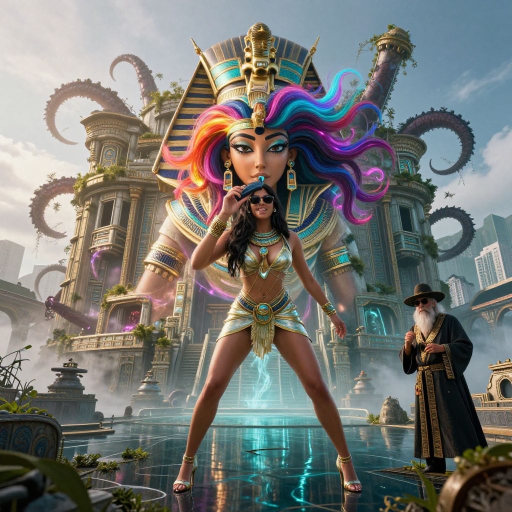 A vibrant digital illustration depicts a dark-skinned woman with long, multicolored hair (purple, blue, pink, orange) in an Egyptian-inspired outfit, including a gold headdress, arm bands, and a beaded skirt. She stands confidently in front of a towering, ornate temple with tentacle-like structures, illuminated by blue light. To her right, an elderly man with a white beard and black hat holds a staff. The background includes misty ruins and modern skyscrapers. The woman's large, expressive eyes and bold makeup contrast with the ancient, mystical setting. The image blends fantasy and ancient Egyptian themes with a modern twist.