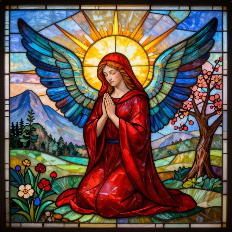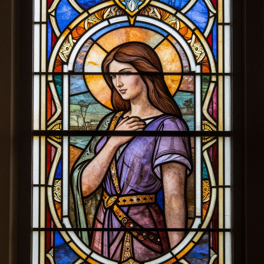 A stained glass window featuring a woman with long hair, surrounded by intricate patterns and vibrant colors.