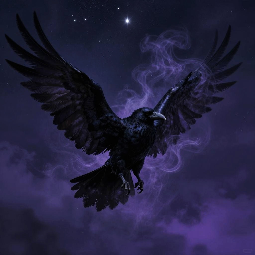 Mythical raven wings open, feathers transitioning into shadowy smoke, dark magic aura, mysterious and ethereal vibe, rich black and purple tones, fantasy creature soaring through a night sky filled with stars
